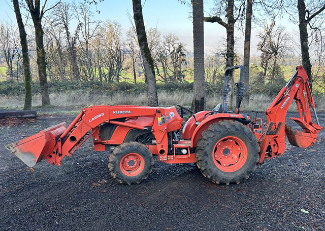 50 HP Kubota Tractor with front-end loader, back hoe and other implements.